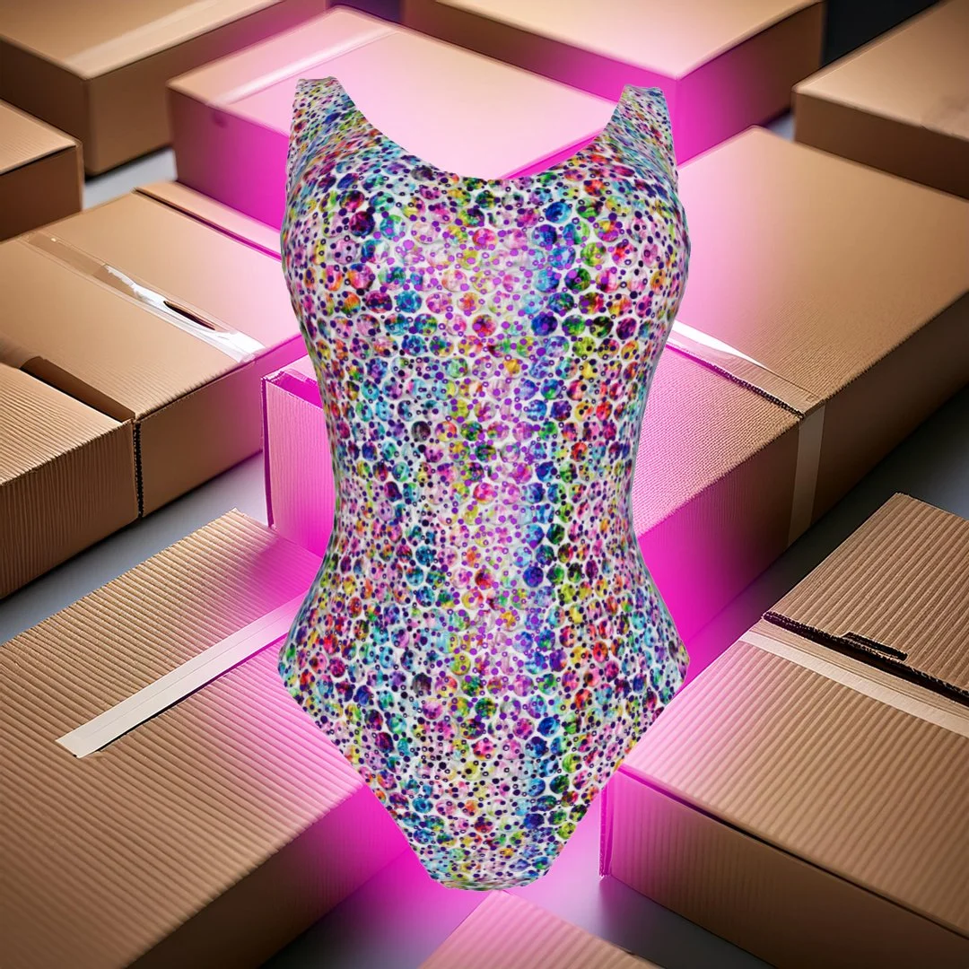 Bade-, Tanz- und Beachanzug "Harlequeen", mit hohen Beinausschnitten und Rüsche am Halsausschnitt.